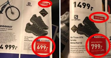 Jan Inge så samme skoen to ganger i samme tilbudsavis fra Intersport. På den ene siden ligger turskoene Salomon XA Ticao GTX ute til medlemspris 699 kroner (ikke-medlem 999 kroner) som skal være en besparelse på 300 kroner. Et annet sted i samme tilbudsavis finner vi de samme turskoene til medlemspris 799 kroner (ikke-medlem 1199 kroner), og da med en besparelse på 400 kroner.
